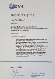 Diese Bescheinigung attestiert die Teilnahme am Seminar für Experten und Expertinnen zur Durchführung von Fremdbewertungen im Rahmen von Validierungsverfahren im Uhrmacherhandwerk